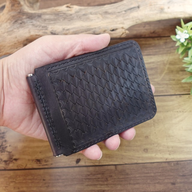 ワイルドなデザインのスタンピング マネークリップウォレット。 仕事からプライベートまで幅広いシーンで活躍します。 カードスロット内には最大6枚のカードを 収納することができ、薄いのでポケットに 納まりがよくコンパクトで持ち運びにも便利です。 高品質の姫路レザーを使用。 個性的なアイテムとなっていて一押しのアイテムです。 ぜひお財布の買い換えのタイミングとして オススメです。ぜひお手に取ってご覧ください。 ※5枚目の画像に載せてますが、購入した革の 穴をあえて使って100%ワイルドウォレットの 完成です!唯一無二なウォレットです。 おおよそのサイズ 厚み:10mm 幅:90mm 長さ:120mm 姫路レザー Black手染め ポリエステルボンド糸 Black タンニンなめし革ですので経年変化をお楽しみ下さい。 天然皮革を使用しているため扱いにはご注意ください。 動物本来のキズ、シワ、シボ等は製品の欠陥ではございません。 御了承の上購入ください。