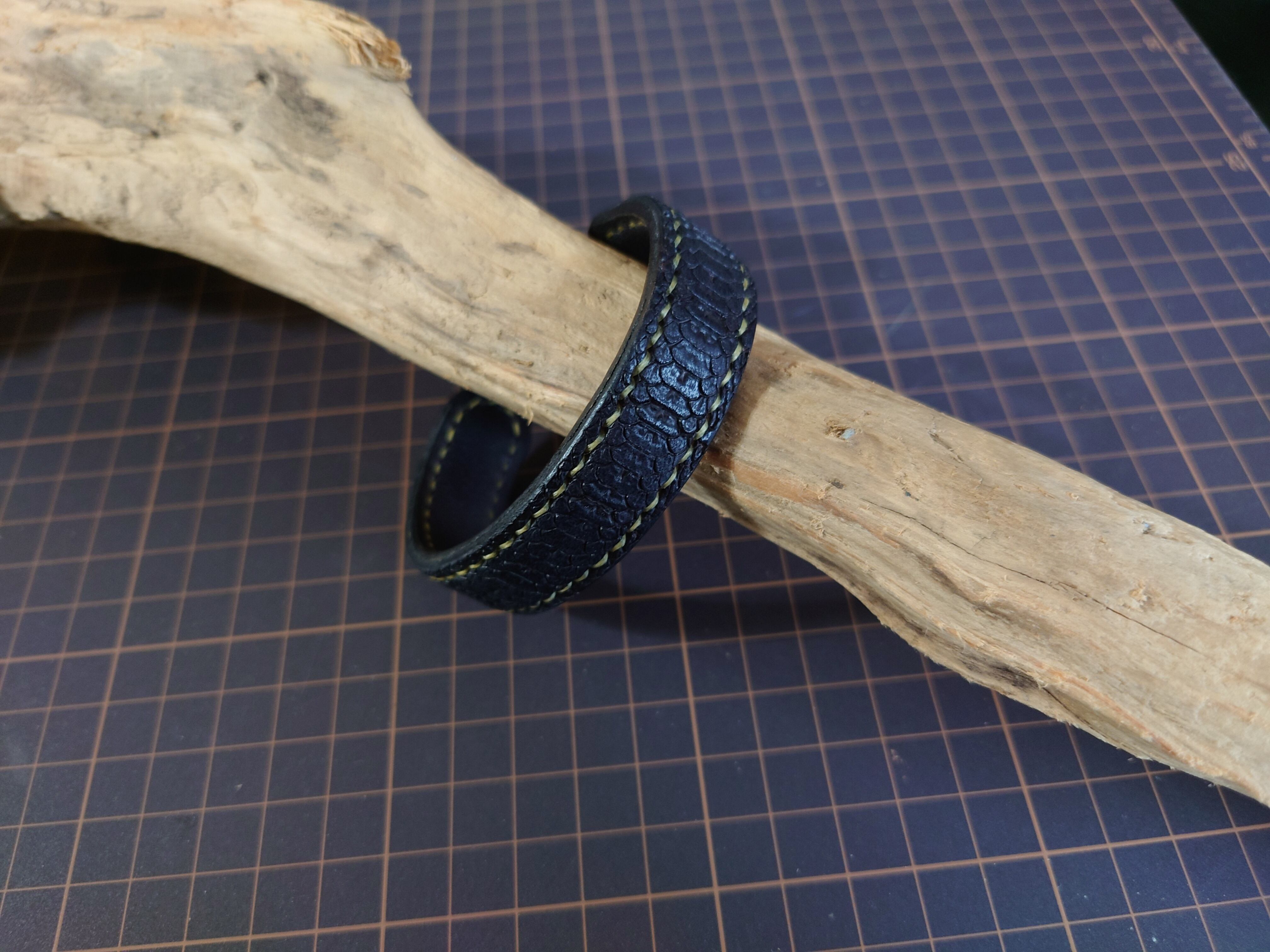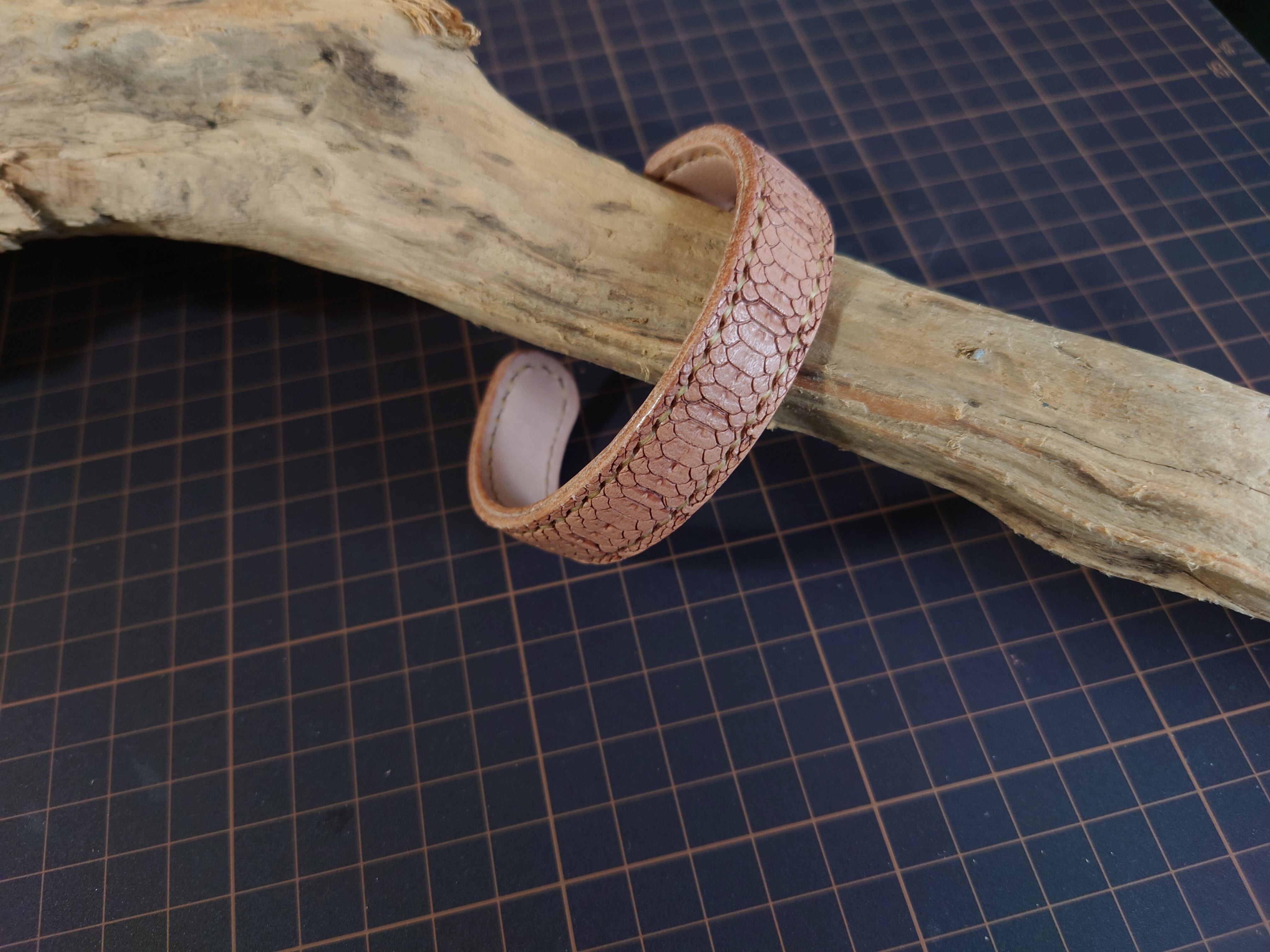 鱗スタンピングのレザーバングルになります。