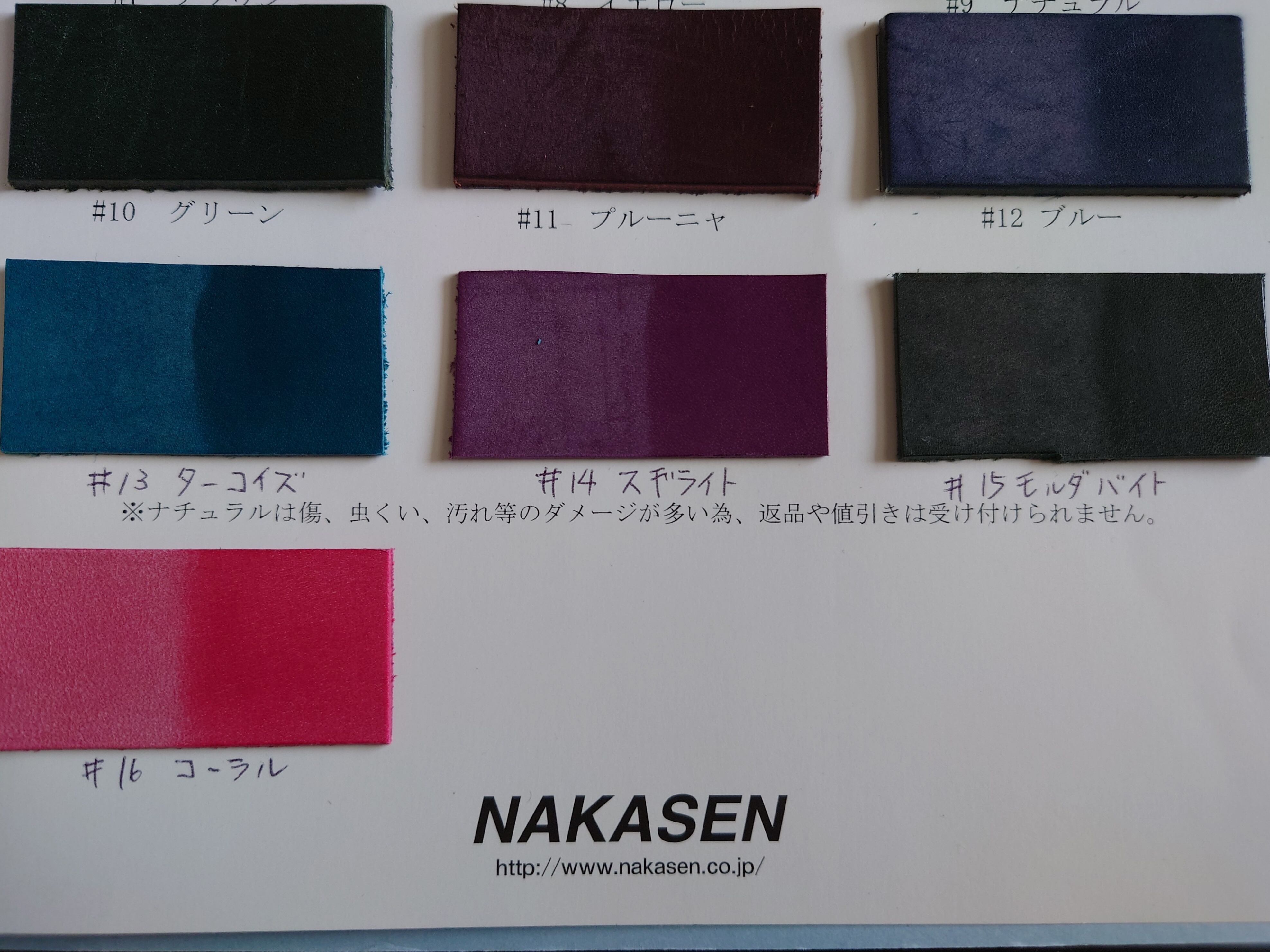 革はナチュラル、ブラック、レッド、ブルー、ターコイズ、グリーン、ブラウン等用意してます。